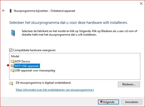 8. Kies "MTP USB-apparaat" (niet "MTP-apparaat) en klik "Volgende".